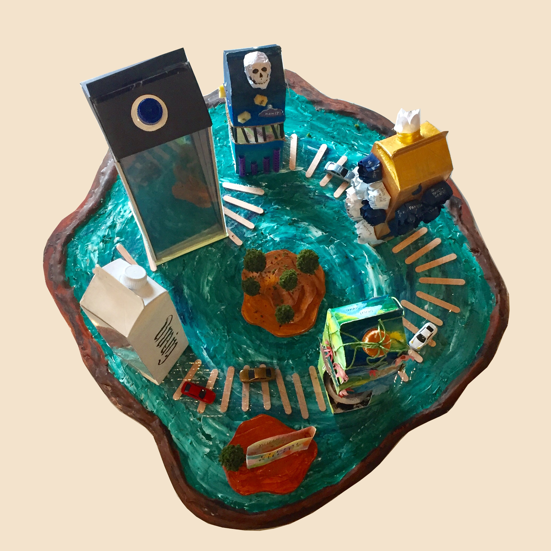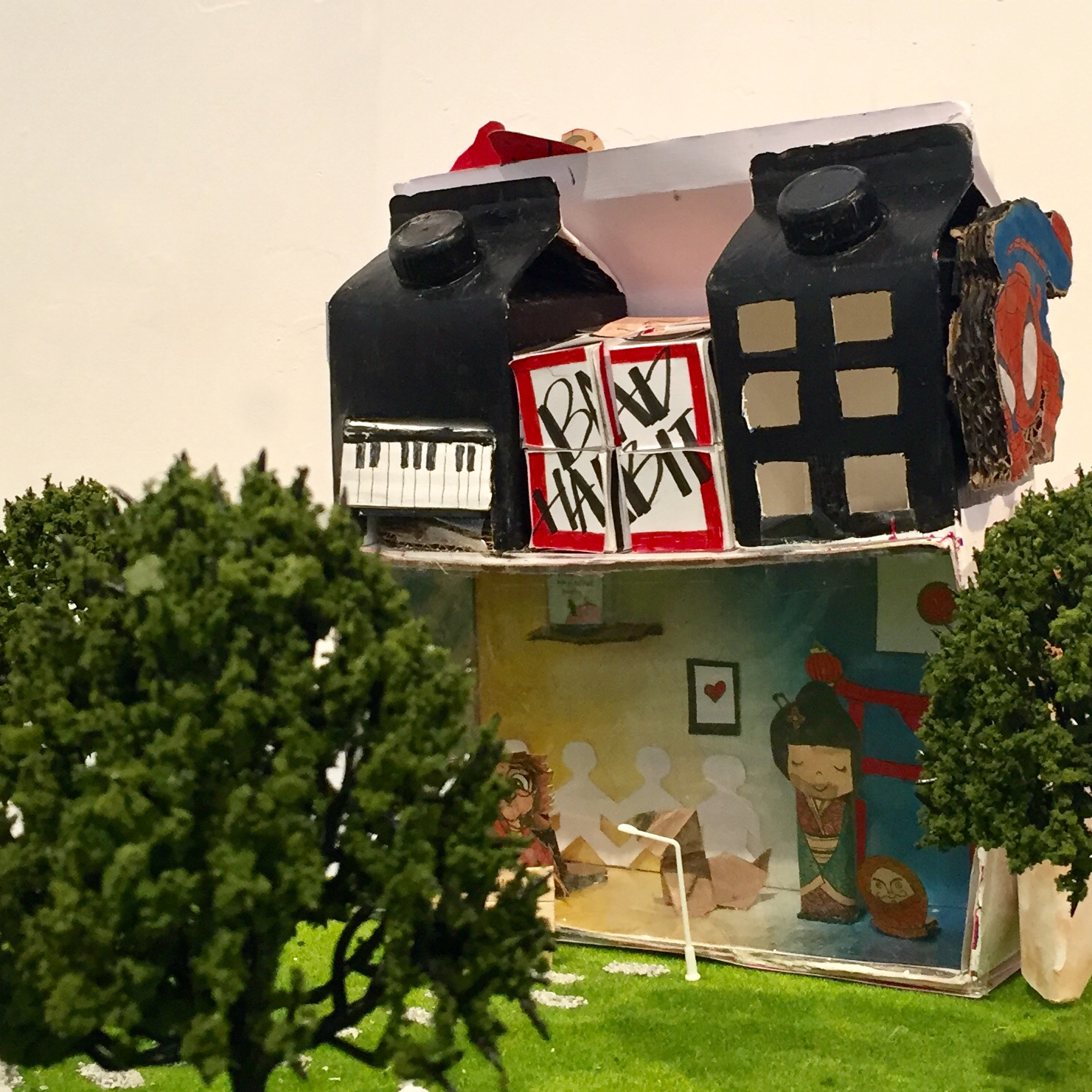 The Proust personality questionnaire asks such things as: Your favourite virtue; Your chief characteristic; Your idea of happiness; Where would you like to live? My heroes in fiction; Your idea of happiness; etc. which allowed the students to explore and expand and examine themselves. Of course, the students then had to find visual ways to express their answers and apply them to milk cartons. The results of the questionnaire were expressed in an amazing range of designs by Foundation students on the requisite milk cartons. Yes, milk cartons. Each student individually interpreted/expressed their results in visual forms on the cartons which became more than reused and repurposed items.