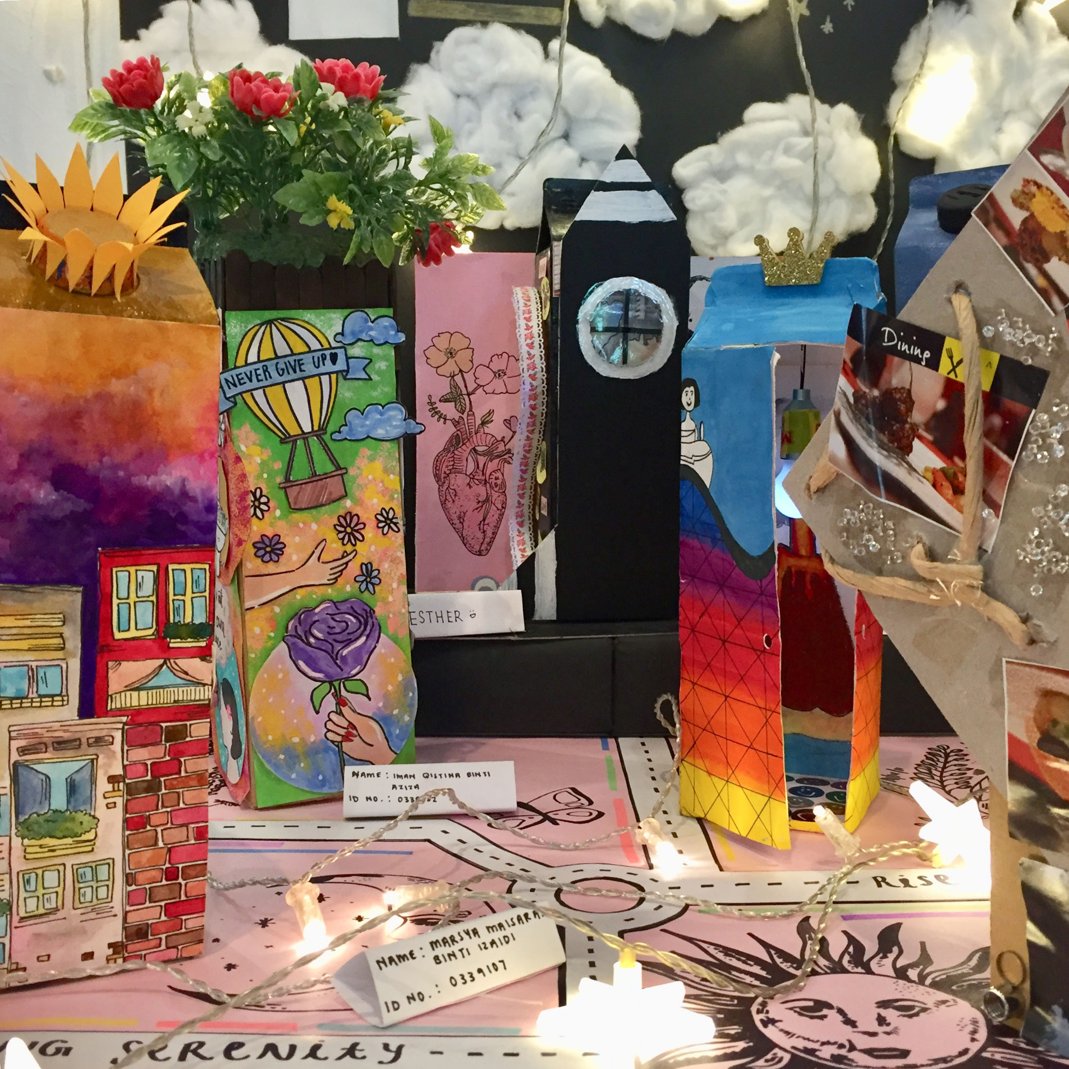 The installation of the milk cartons took these items to even more amazing results since the students were formed into groups who found individual ways to arrange and install the works. Cartonopia represents each of the 400 plus personalities and talents of two cohorts (January and March) from the Foundation programmes — Foundation in Arts, Foundation in Design, Foundation in Natural Built Environment, and Foundation in Science who were part of the Creative Thinking Skills module which is offered across these four foundation programmes.