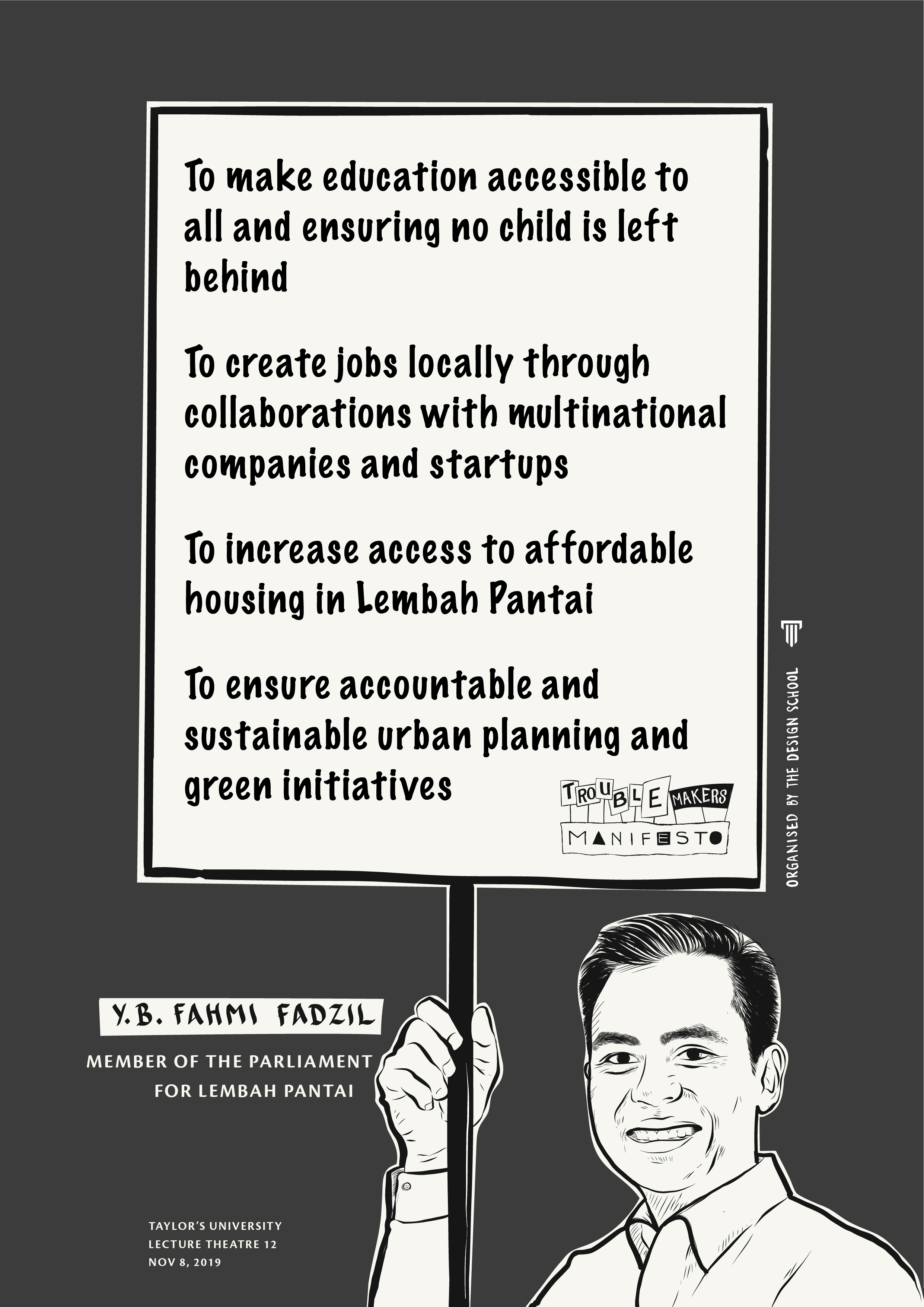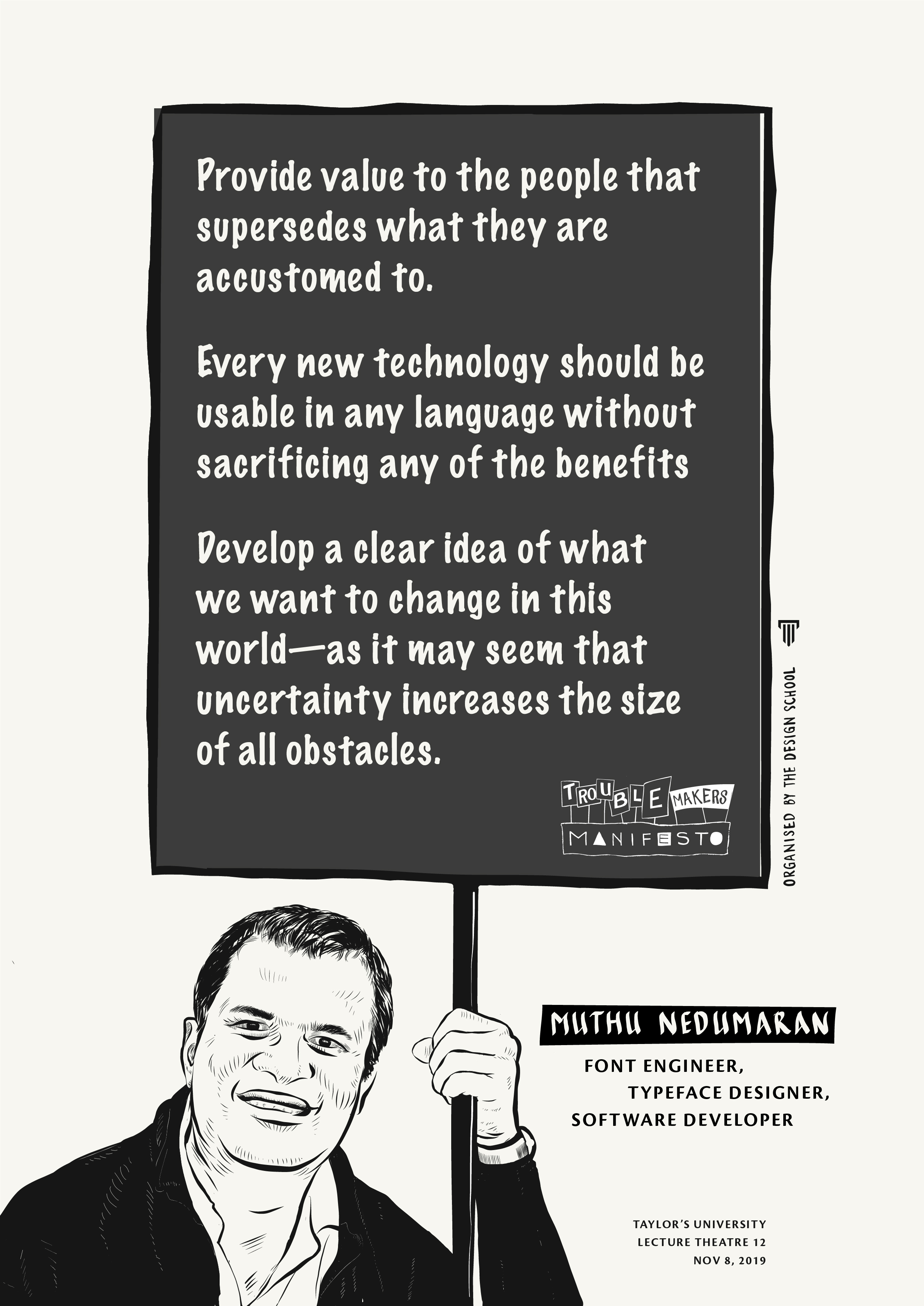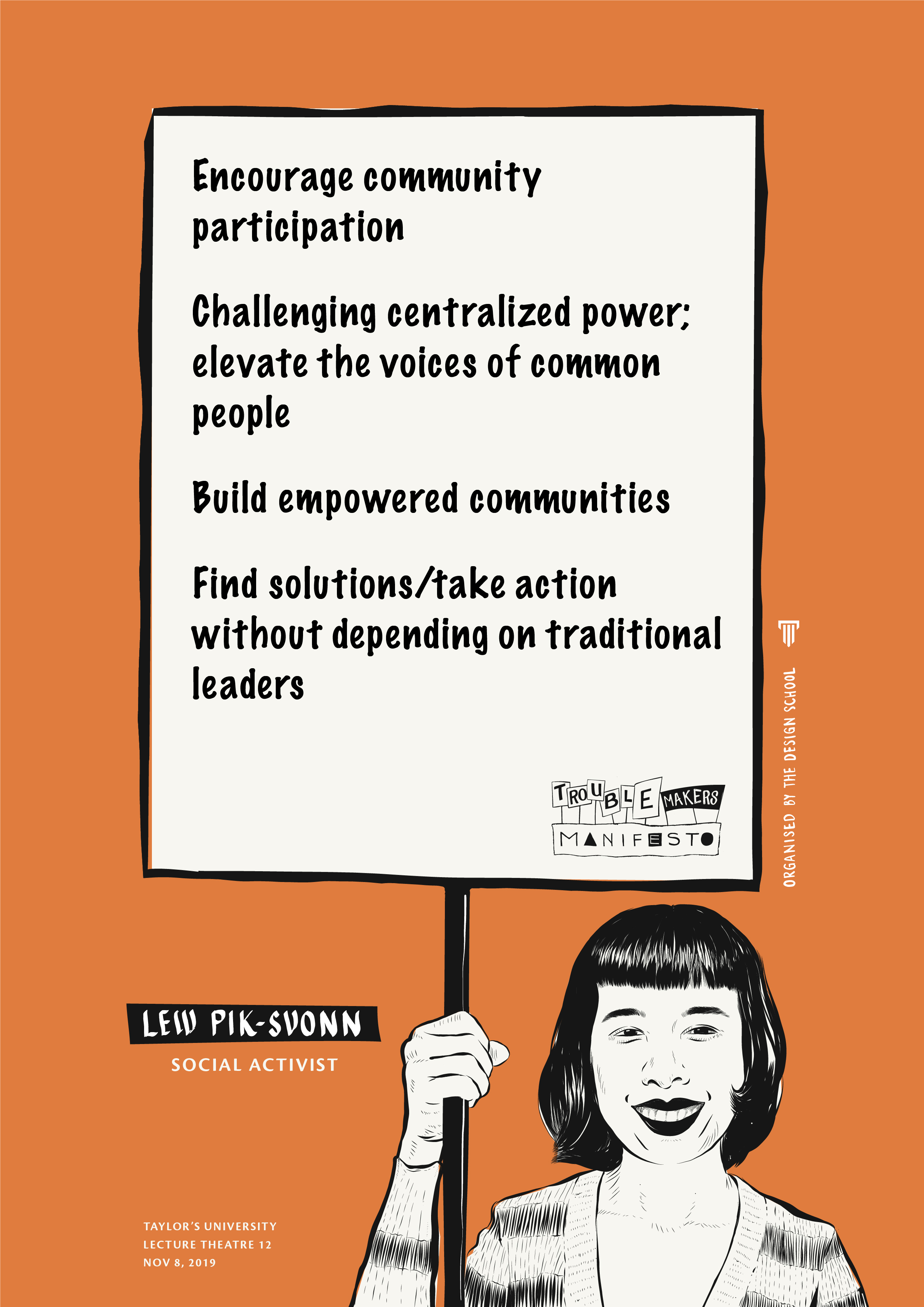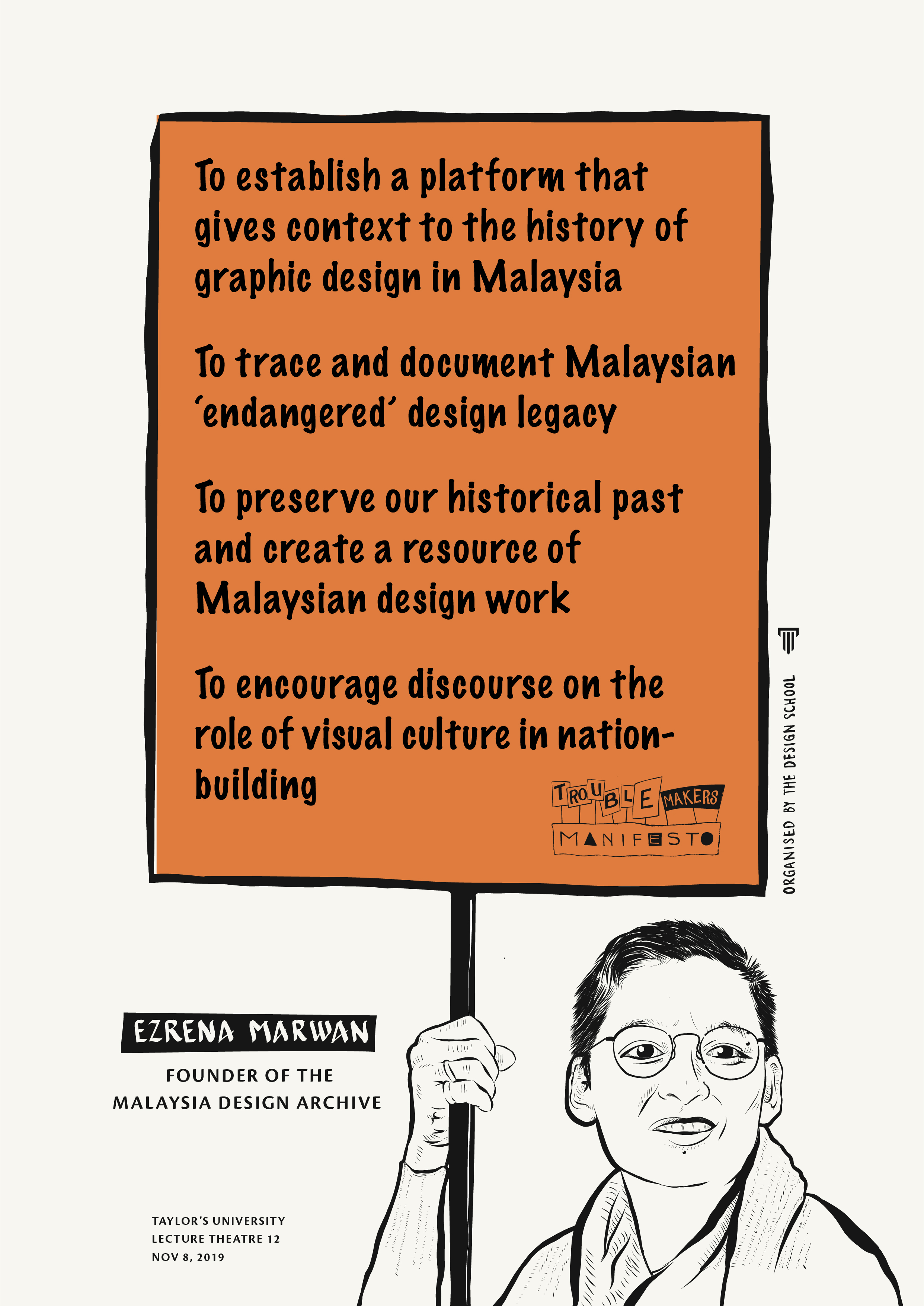 Being rebellious is often linked to teenage angst or people who refuse to grow up and take responsibility of their own actions. Designers and artists seldom escape this stereotype. Oftentimes, they are seen as troublemakers – challenging the norms of society, questioning the status quo. On 8 November 2019, Troublemakers’ Manifesto, a colloquium that was organised by The Design School at Taylor’s University, took on the semantics of rebel but with direction and good intentions for a better society. This gives troublemaking another perspective to be examined.